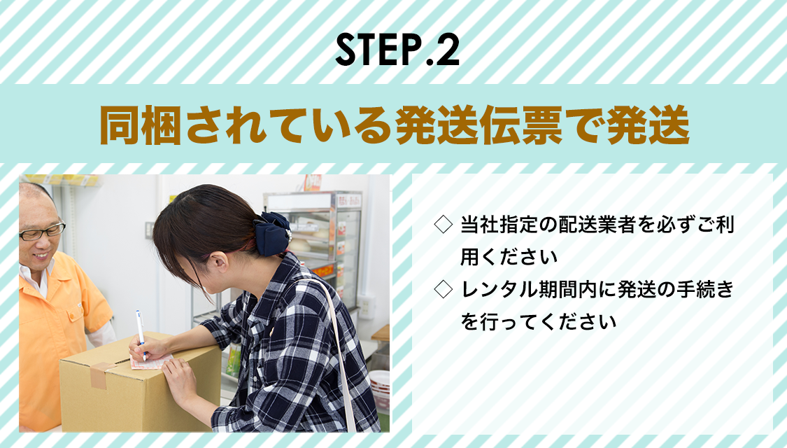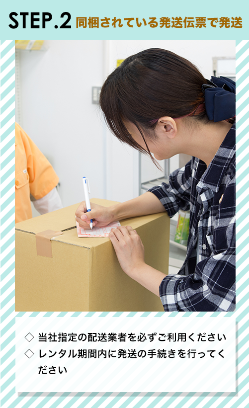 返品時はお届け時の段ボールを使用していただき、同梱されている配送伝票をご利用ください。
