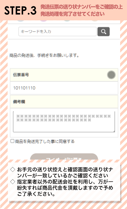 商品受取日(配達が完了した日)を含め3日以内に商品の発送手続きおよびマイページにて発送処理を行ってください。