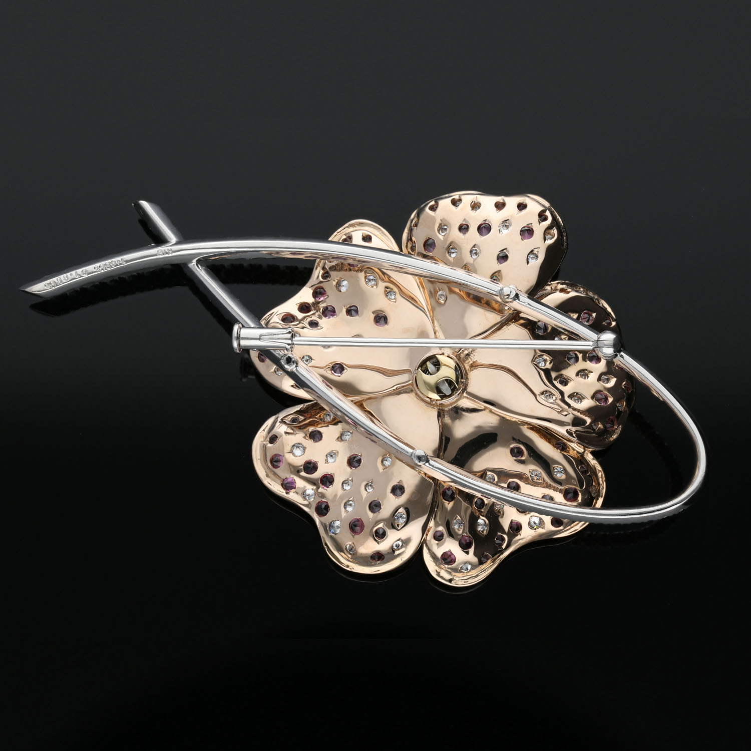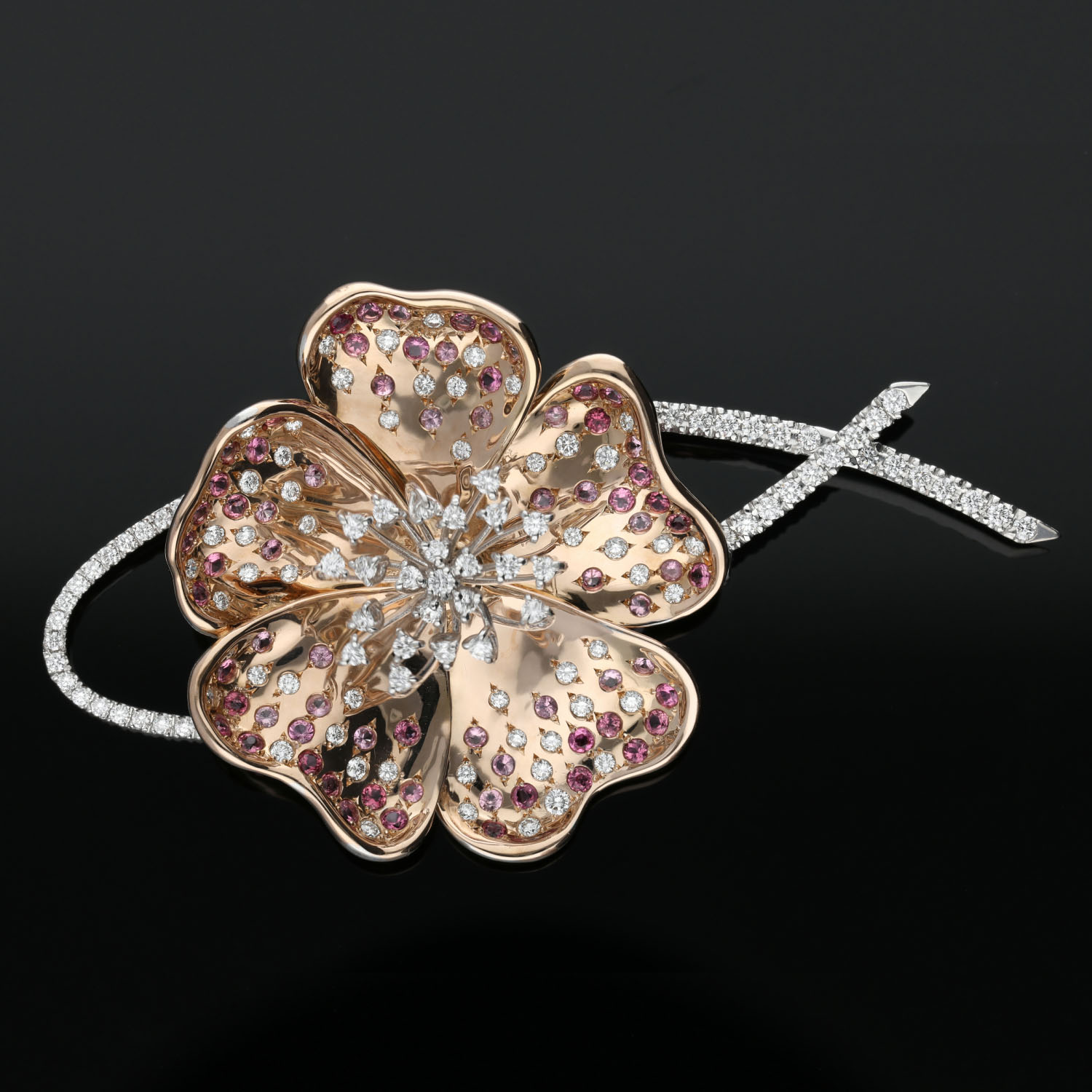 ピンクゴールドの花びらに散りばめられダイヤモンドとピンクサファイアの煌めきがとても素敵ブローチになります。